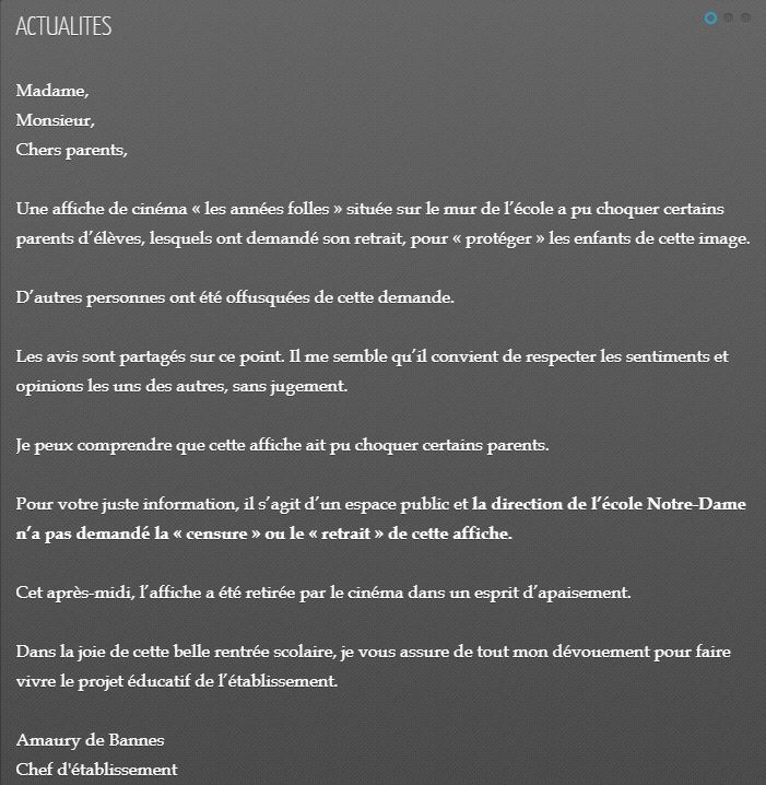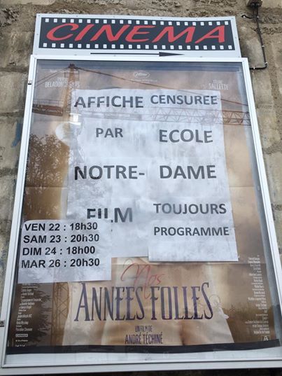 Marilke Fleury, responsable d’exploitation de la salle, explique l’affaire qui a connu plusieurs rebondissements: «Jeudi matin, j’ai reçu un premier appel de la Présidente d’une association catholique en charge de la gestion de l’école me demandant de déplacer l’affiche, car elle pouvait heurter la sensibilité des enfants. J’ai refusé ce que je considérais comme une censure, ni le film ni l’affiche n’ayant été interdits ou même fait le cas d’une polémique».