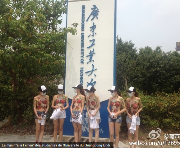 Les six étudiantes de l’université technologique du Guangdong, la grande province côtière du sud de la Chine, l’une des plus développées économiquement, se sont installées calmement devant le panneau indiquant le nom de leur université, et ont retiré leurs T-shirts.