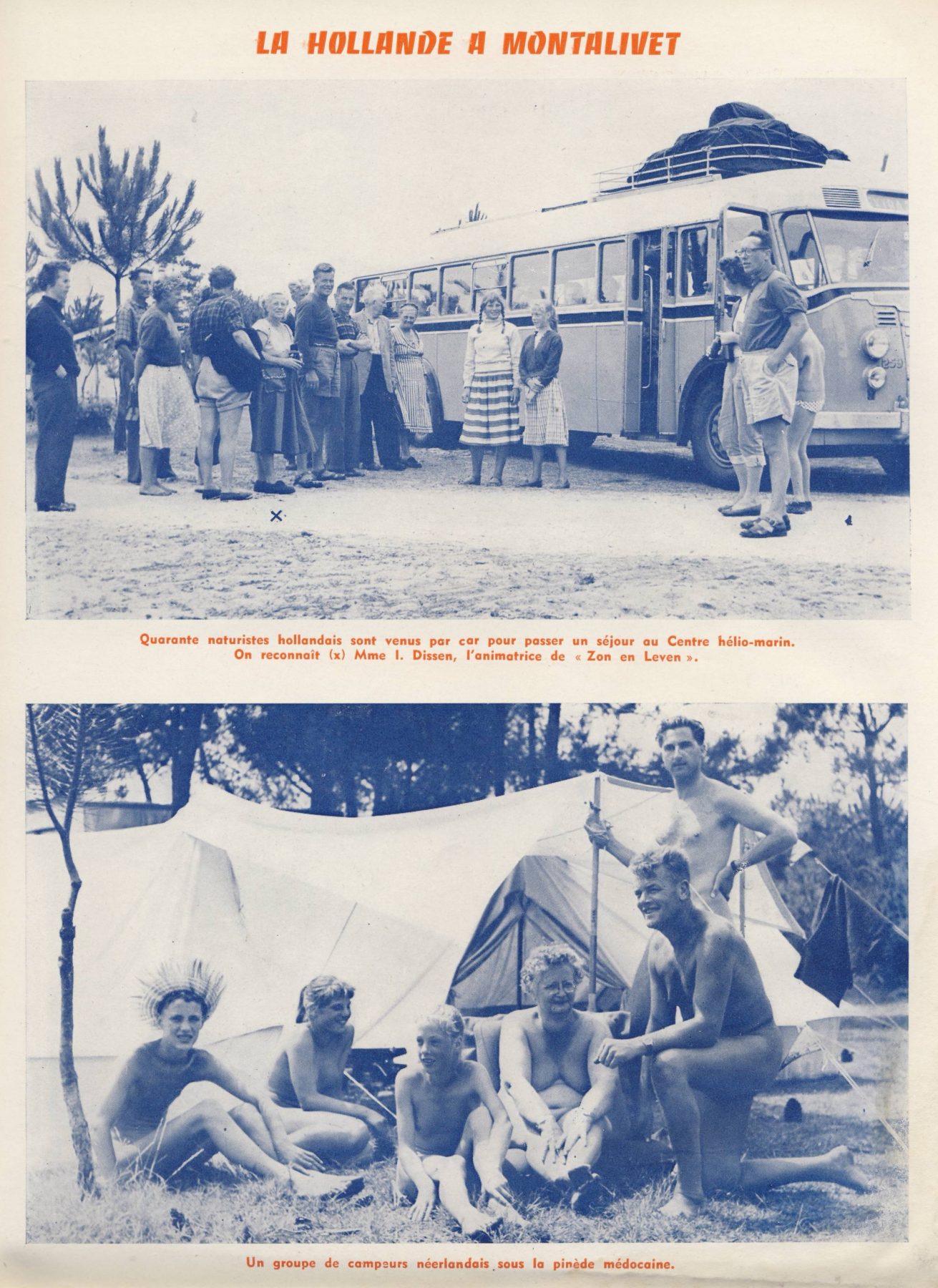 Assez maladroitement, la FFN dira souvent dans ses revues que le CHM de Montalivet était le premier centre naturiste français, oubliant toute la partie de l’histoire de notre mouvement qui a précédé la guerre. C’est sous l’impulsion du couple Lecocq que le Centre héliomarin de Montalivet accueille ses premiers estivants en 1950. Il est installé sur un terrain calciné dont personne ne veut, ravagé par un incendie, qui porte encore les stigmates de la guerre, des douilles jonchant le sol. Les installations se font à la sueur des bénévoles. Ce ne sera pas sans peine : des manifestations sont organisées pour empêcher leur implantation ; l’évêque de Bordeaux prendra la tête de nombreux cortèges, mais perdra toute crédibilité quand le public saura que ceux-ci sont financés par les maillots Arena ! Plus dramatique est la mort du maire de Montalivet, Jean Monget, suicidé sous la pression des villageois qui lui en voulaient d’avoir donné son aval à Lecocq, avec lequel on lui promettait de finir en Enfer.
