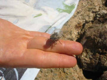 Moment exceptionnel, une cigale vient se poser sur ma main et me laisse le temps de prendre l'appareil pour la prendre en photo.