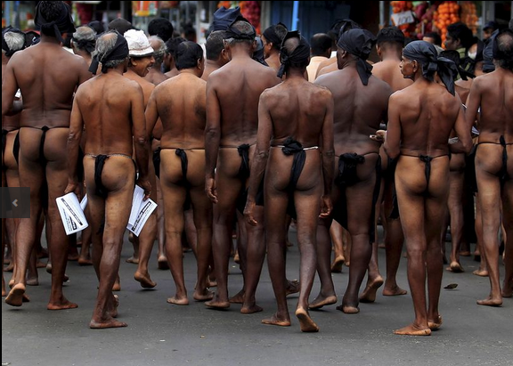 2 décembre, à Colombo (Sri Lanka), des paysans en tenue traditionnelle manifestent pour protester contre le budget présenté au Parlement, qui prévoit des hausses d'impôt et des coupes dans les projets d'aménagement.