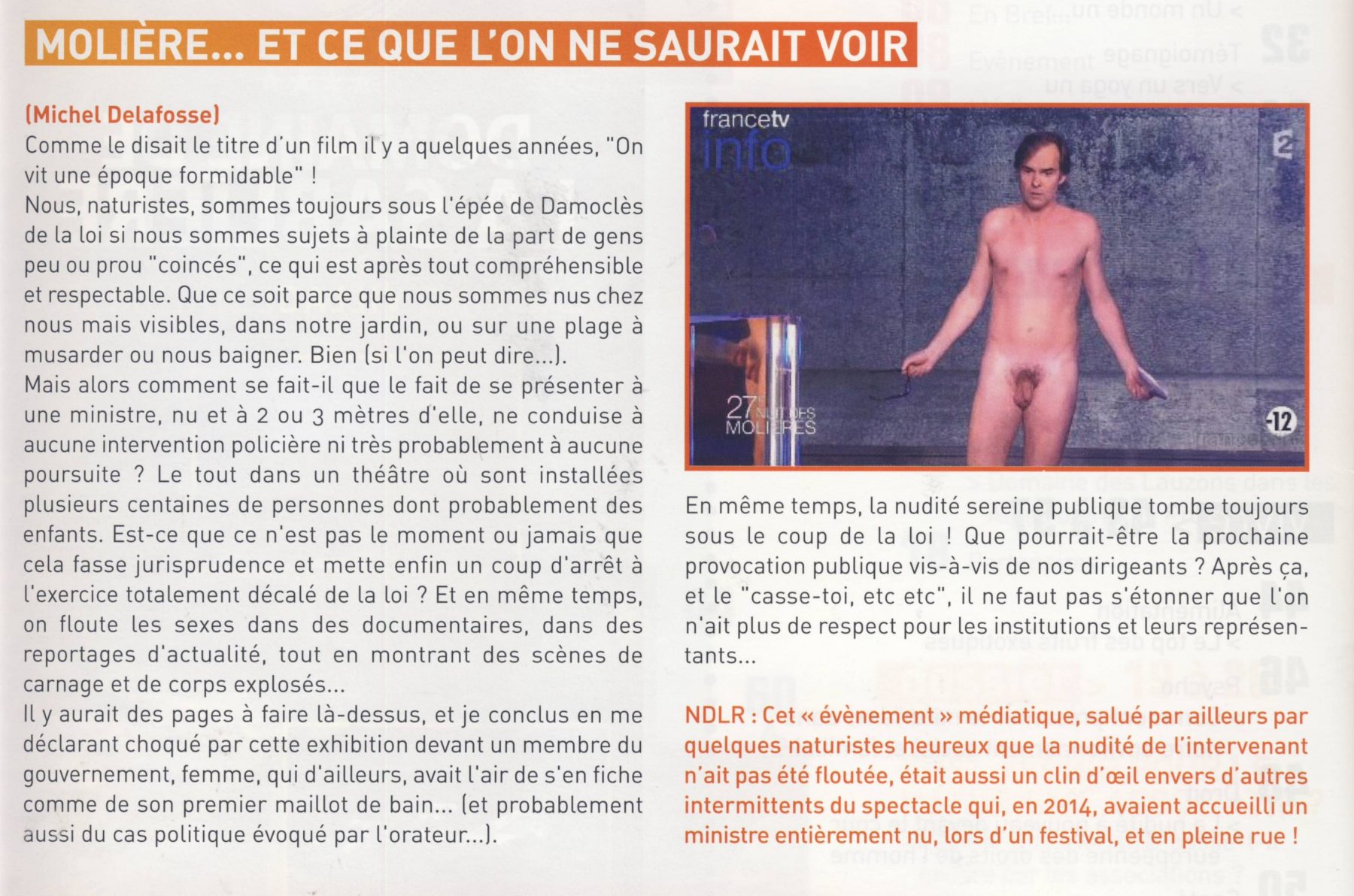 Nudité non floutée à l’écran Auteur/autrice de la publication :Bruno Saurez Publication publiée :4 mars 2018 Post category:Art et nudité / La loi et le naturisme / Société Commentaires de la publication :1 commentaire Extrait de Naturisme Magazine n°36 – juin 2015 Vous devriez également aimer Bilan action « Calanques Propres 2016 » 17 septembre 2016 La censure aveugle et stupide de Facebook 4 juillet 2018 Signification symbolique du vêtement 19 mars 2015 Cette publication a un commentaire Jeanmarc 6 mars 2018 Répondre Bonjour, je ne pense pas que le CSA interdise la simple nudité. Le floutage des reportages naturiste est, il me semble, de la propre initiative des chaînes TV, de l’autocensure. Laisser un commentaire Annuler la réponseCommentEnter your name or username to comment Enter your email address to comment Saisir l’URL de votre site (facultatif)